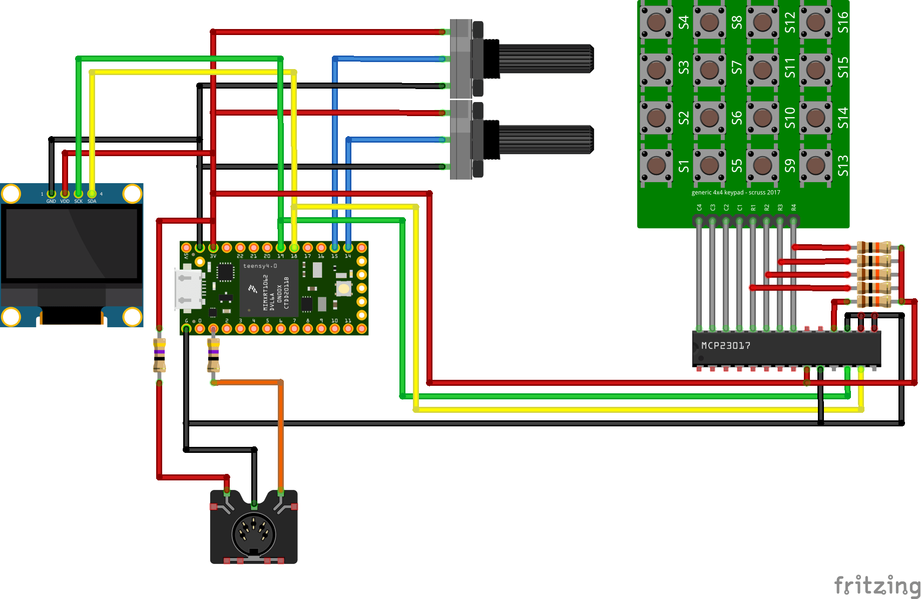 - Teensy 4.0 (because I needed multiple analogue inputs, I used another controller before, with an analogue multiplexer. But I wanted to use the easy method to use USB as midi also.