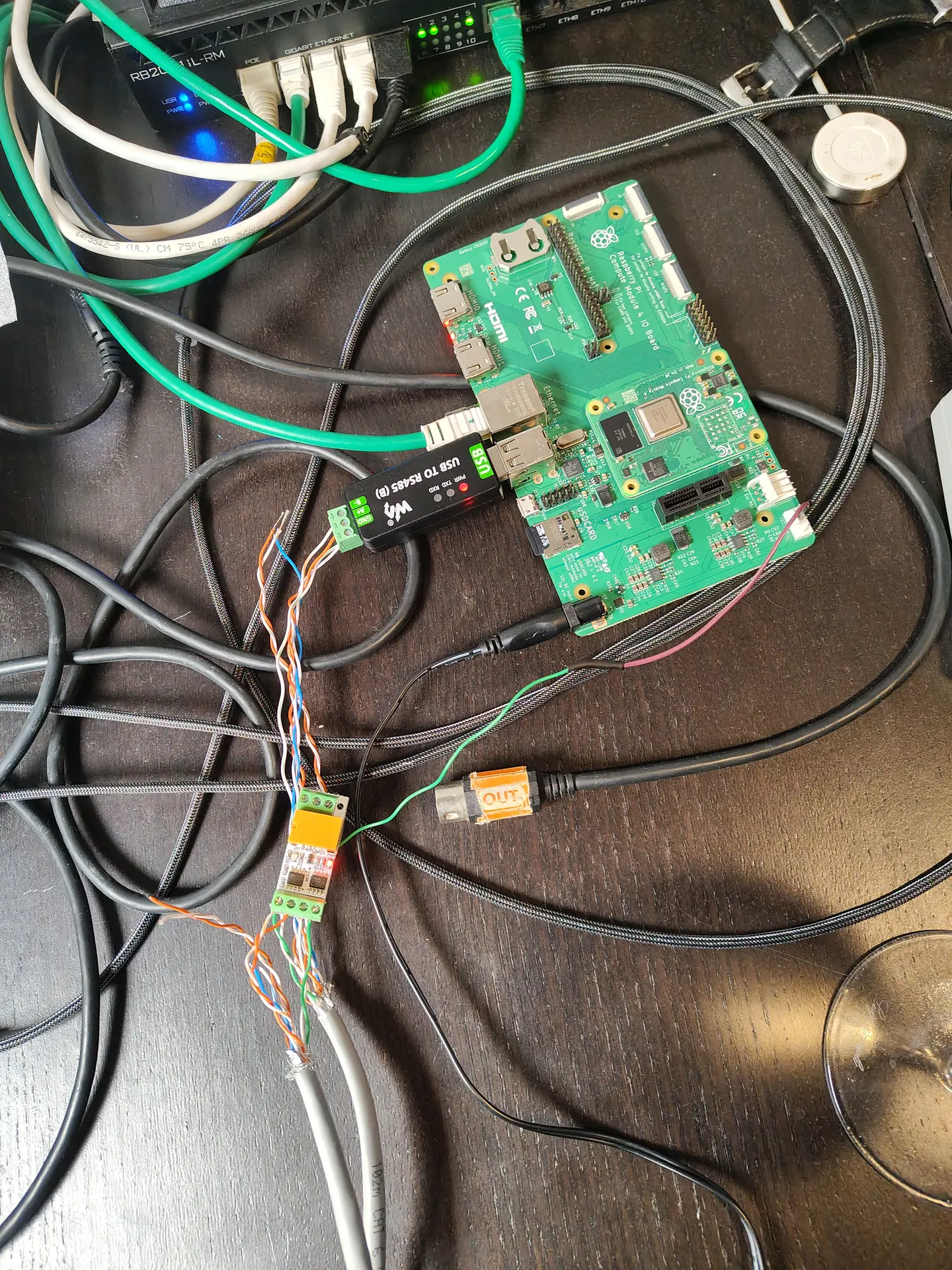 Working 12V relay bottom left, and upper right the Raspberry $ compute module board with NodeRed.